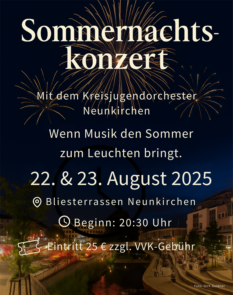 Am 22. und 23. August 2025 laden die Sommernachtskonzerte an den Bliesterrassen erneut zu zwei stimmungsvollen Abenden ein. Das Kreisjugendorchester Neunkirchen (KJO) verspricht ein genreübergreifendes Programm, eindrucksvolle Lichtinszenierungen und eine mitreißende Pyroshow.